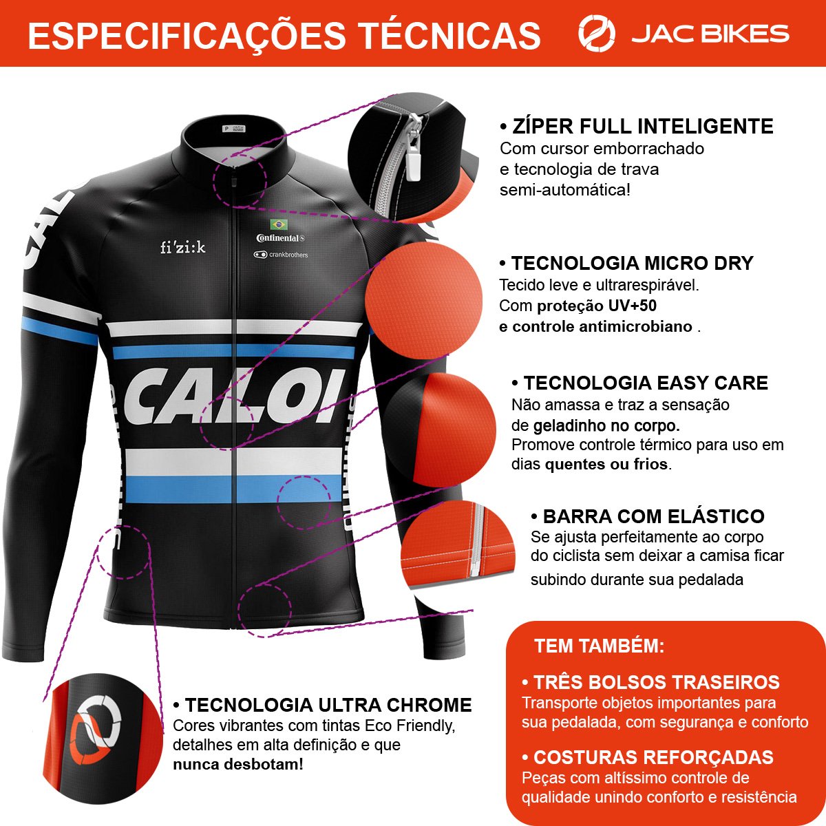 – Tecidos tecnológicos para melhor conforto e performance, eliminando o atrito e retenção de calor;