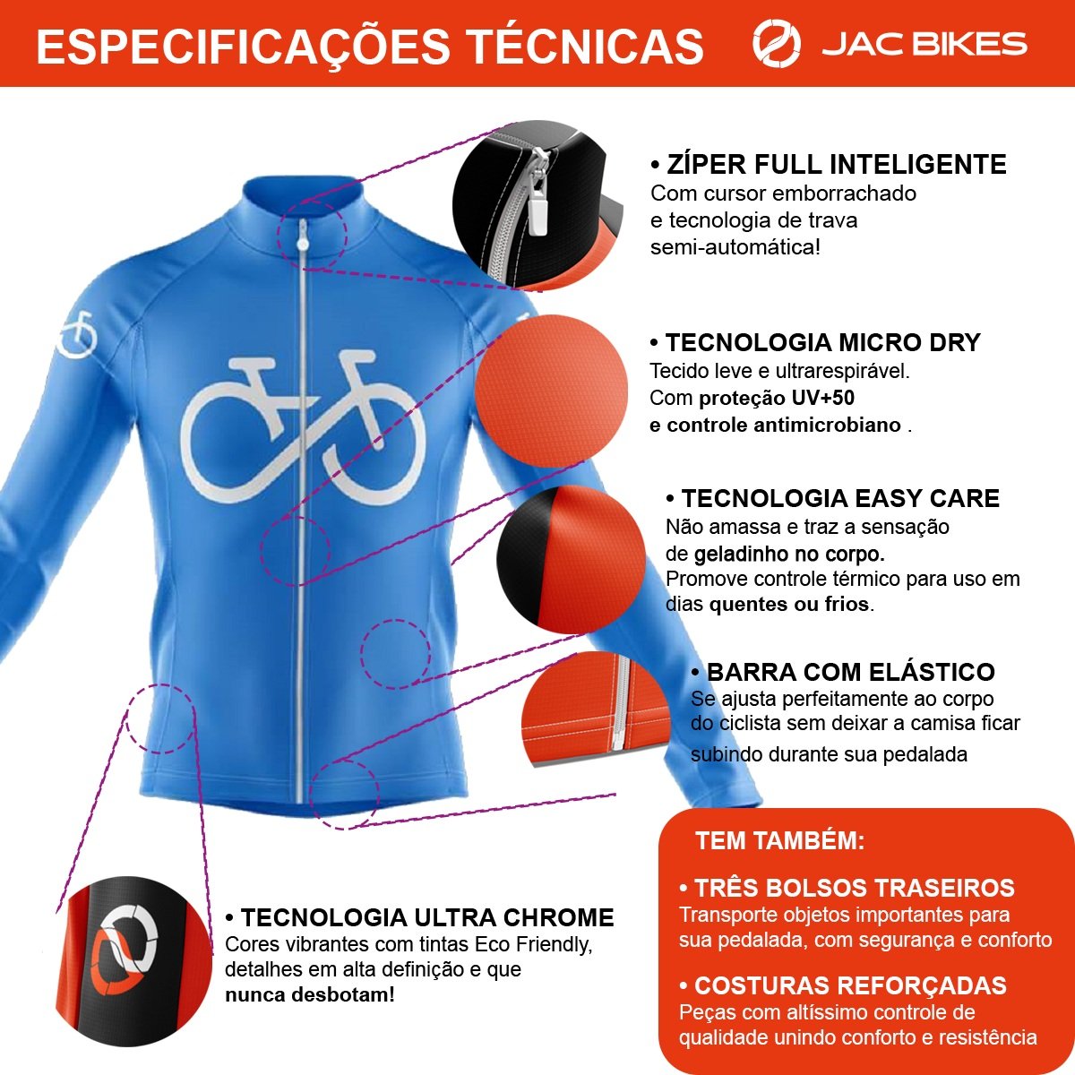 – Tecidos tecnológicos para melhor conforto e performance, eliminando o atrito e retenção de calor;