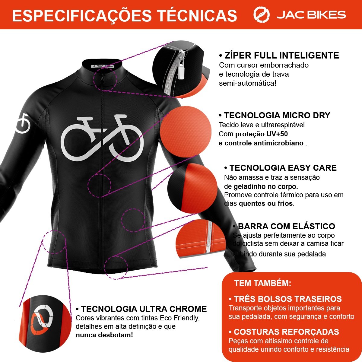 – Tecidos tecnológicos para melhor conforto e performance, eliminando o atrito e retenção de calor;