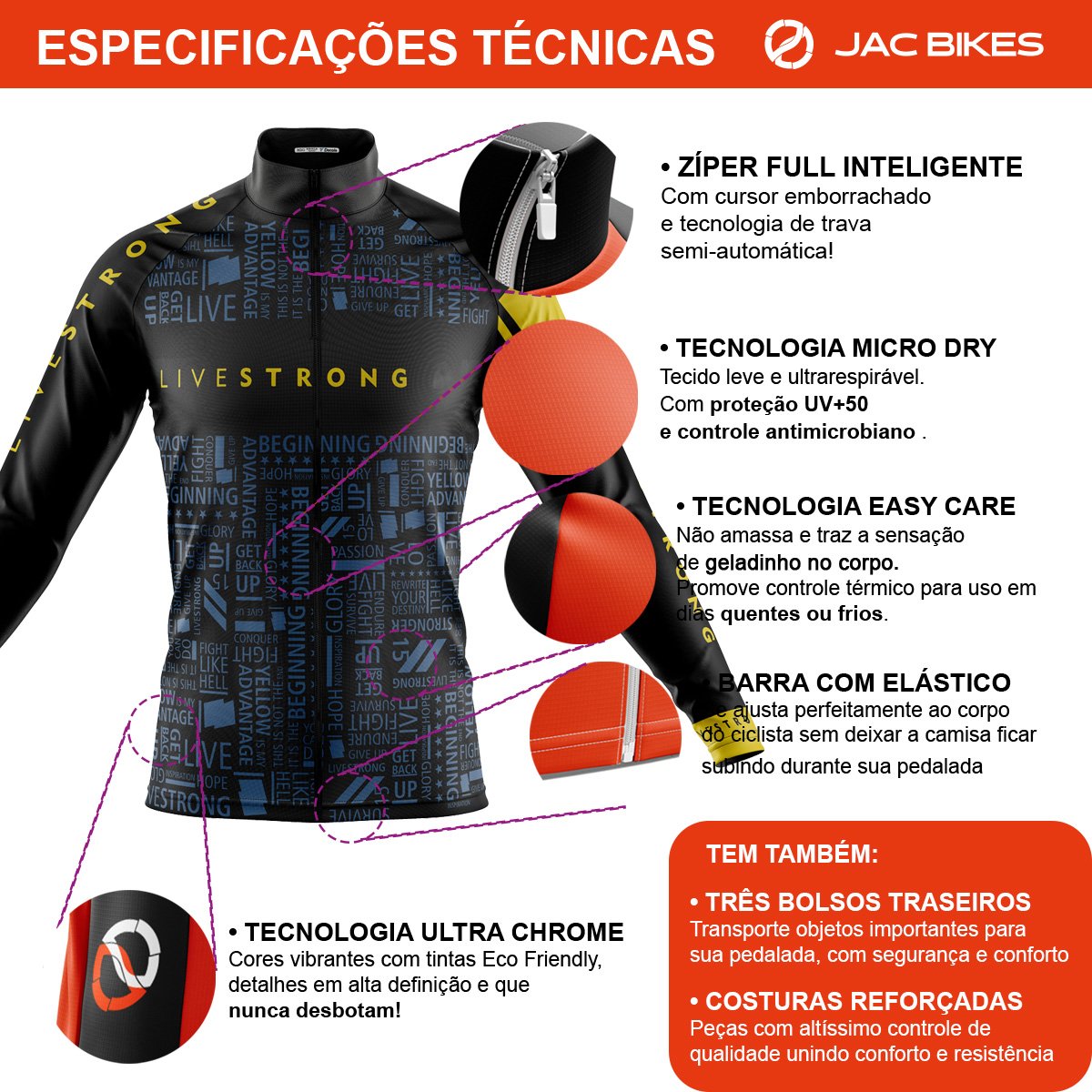 Eliminação de Atrito e Calor: Tecidos tecnológicos que eliminam o atrito e retenção de calor, proporcionando uma pedalada mais confortável e eficiente.